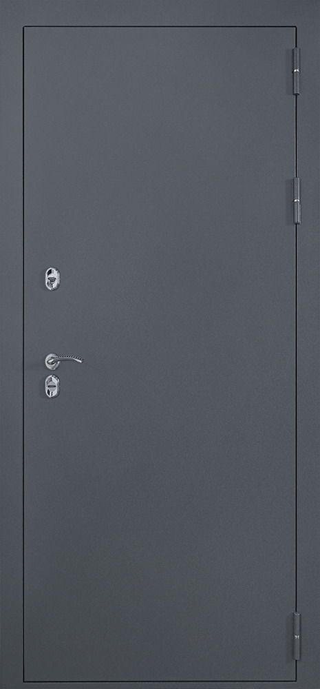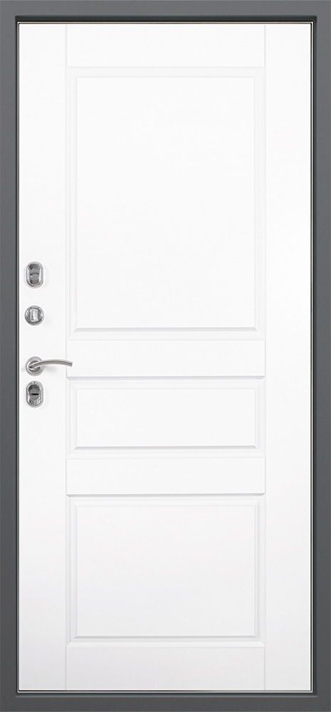 Толщина полотна — 110 мм. Дверная коробка с терморазрывом, три контура уплотнения, глубина 140 мм. Петли — 3 шт. с подшипником. Внешняя отделка — лист металла с порошковым покрытием и гладким наличником. Внутренняя отделка — панель МДФ 10 мм, цвет «белый матовый», объемная фрезеровка. Фурнитура включает ручку и ночную задвижку на круглой розетке, цвет «хром».