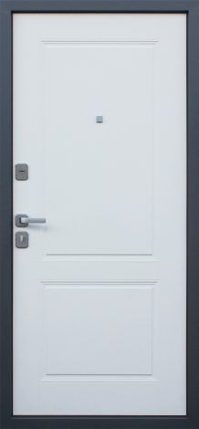 Покрытие двери — «Букле графит». Размеры упаковки: 2150 мм × 970 мм × 110 мм и 2150 мм × 1070 мм × 100 мм. Дверная коробка П-2 с двумя контурами уплотнения. Внешняя отделка: металлический лист 1,2 мм с декоративным штампом, порошковое покрытие, прямые наличники. Внутренняя отделка: панель ФЛ 6 мм, цвет «Ясень белый снег». Замки: нижний — Галеон 1211 цилиндровый, верхний — Галеон 1001 сувальдный, с накладками на сувальдном замке со шторками автомат КЛС. Фурнитура: ручка и глазок на квадратной розетке, цвет «Хром матовый». Дополнительно: евроцилиндр К-В с перфокартой, врезная броненакладка, три антисъемных штыря. Утеплитель — пенополистирол высокой плотности «ПСБ-С15». Тип открывания — правое и левое.