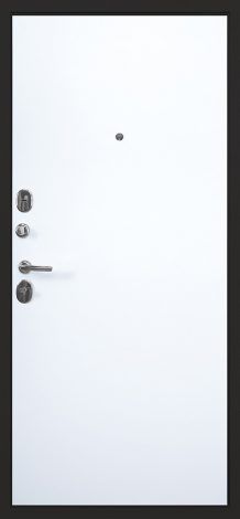Толщина дверного полотна составляет 80 мм. Внешняя отделка выполнена из металлического листа толщиной 1 мм с экошпонированной МДФ-панелью толщиной 6 мм в цвете «брендс MD-40 черный». Дополнительно установлен гладкий МДФ-наличник шириной 80 мм в черном цвете. Внутренняя отделка представлена экошпонированной МДФ-панелью толщиной 6 мм в цвете «белый матовый».
