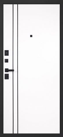 Толщина полотна составляет 100 мм, дверная коробка с тремя контурами уплотнения имеет глубину 90 мм. Внешняя отделка выполнена металлическим листом 1,5 мм и МДФ-панелью 10 мм цвета «графит» с вертикальной вставкой из черного лакобеля. Горизонтальный наличник МДФ 150 мм и вертикальный 100 мм продолжают декоративный дизайн. Внутренняя отделка — МДФ 10 мм цвета «белый матовый» с декоративными молдингами 10 мм черного цвета. Дополнительно установлены евроцилиндр К-В (перфокарта), врезная броненакладка и три штыря противосъемные. Упаковка двери: 2140×1040×130 мм и 2140×1130×130 мм.
