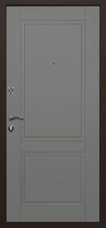 Покрытие двери — медный антик. Размеры упаковки: 2150 мм × 970 мм × 110 мм и 2150 мм × 1070 мм × 100 мм. Дверная коробка П-2 толщиной 94 мм с двумя контурами уплотнения. Внешняя отделка: лист металла 1,2 мм. Внутренняя отделка: панель ФЛ 6 мм, цвет «Эко дуб». Замки: нижний — Галеон 1211 цилиндровый, верхний — Галеон 1001 сувальдный. Фурнитура: ручка и глазок цвет «Хром», евроцилиндр К-В, накладки со шторками автомат КЛС, три антисъемных штыря. Утеплитель — пенополистирол высокой плотности «ПСБ-С15». Тип открывания — правое и левое.