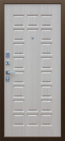Покрытие двери — Антик медь. Размеры упаковки: 2150 мм × 1030 мм × 120 мм и 2150 мм × 1130 мм × 120 мм. Дверная коробка ДГ5К3 с тремя контурами уплотнения. Внешняя отделка: металлический лист 1,5 мм, фигурный наличник. Внутренняя отделка: МДФ 10 мм с ПВХ-плёнкой, объемная фрезеровка, цвет «Беленный дуб». Замки: нижний — Guardian 3211, верхний — Guardian 3001, с накладками на сувальдном замке со шторками автомат КЛС-13. Фурнитура: ручка и глазок на квадратной розетке, цвет «Хром матовый». Дополнительно: евроцилиндр К-В с перфокартой, врезная броненакладка, три антисъемных штыря. Утеплитель — пенополистирол высокой плотности «ПСБ-С15». Тип открывания — правое и левое.