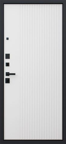 Толщина дверного полотна составляет 100 мм. Конструкция дверной коробки оснащена тремя контурами уплотнения. В системе навеса используются три петли с подшипником. Внешняя отделка выполнена из металлического листа толщиной 1,5 мм с экошпонированной панелью МДФ толщиной 10 мм, линейной фрезеровкой и цветовым исполнением «графит». Внутренняя сторона двери оформлена экошпонированной панелью МДФ толщиной 10 мм с линейной фрезеровкой в цвете «капучино ZB 853-2». Дверь комплектуется нижним цилиндровым замком Guardian 3211 и верхним сувальдным замком Guardian 3001. Установлена фурнитура черного цвета на квадратной розетке, включающая ручку, ночную задвижку и глазок. Дополнительно предусмотрен порог из нержавеющей стали в цвете «хром». В качестве утеплителя используется базальтовый материал. Возможны правое и левое открывания.