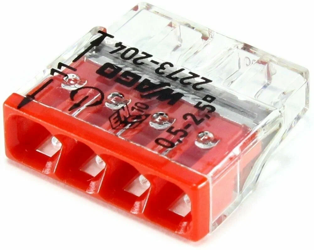 Клемма WAGO используется для соединения проводов с одной или несколькими жилами, а также разных сечений. У этого способа скрепления есть ряд преимуществ: высокая скорость соединения, надежность и удобство дальнейшей работы с проводами, их обслуживания.Проводящая часть соединителя изготовлена из меди.