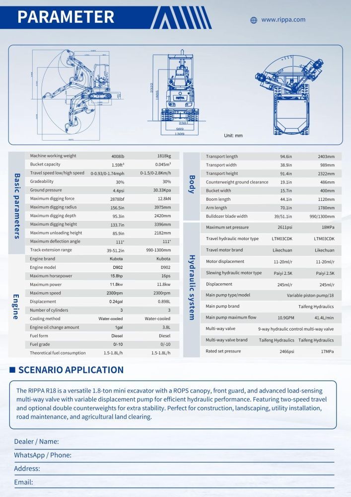 Rippa R18 (он же R18-3 или R18 Pro) – среднетоннажный мини-экскаватор весом 1818 кг и японским дизельным двигателем Kubota D902 мощностью 16.1 л.с. и с большой для такого класса техники глубиной копания в 2420 мм. В данной модели акцент сделан на технологичность. Отдельное внимание уделено комфорту водителя-оператора. Раздвижные гусеницы с шириной от 989 мм до 1309 мм. и поворотная стрела увеличат производительность и эффективность работ.