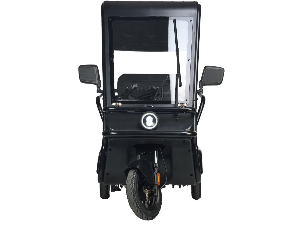Большие зеркала заднего вида обеспечивают отличный обзор, что делает управление трициклом безопасным и комфортным. Цветной дисплей на приборной панели позволяет легко отслеживать скорость, уровень заряда батареи и другие важные параметры.