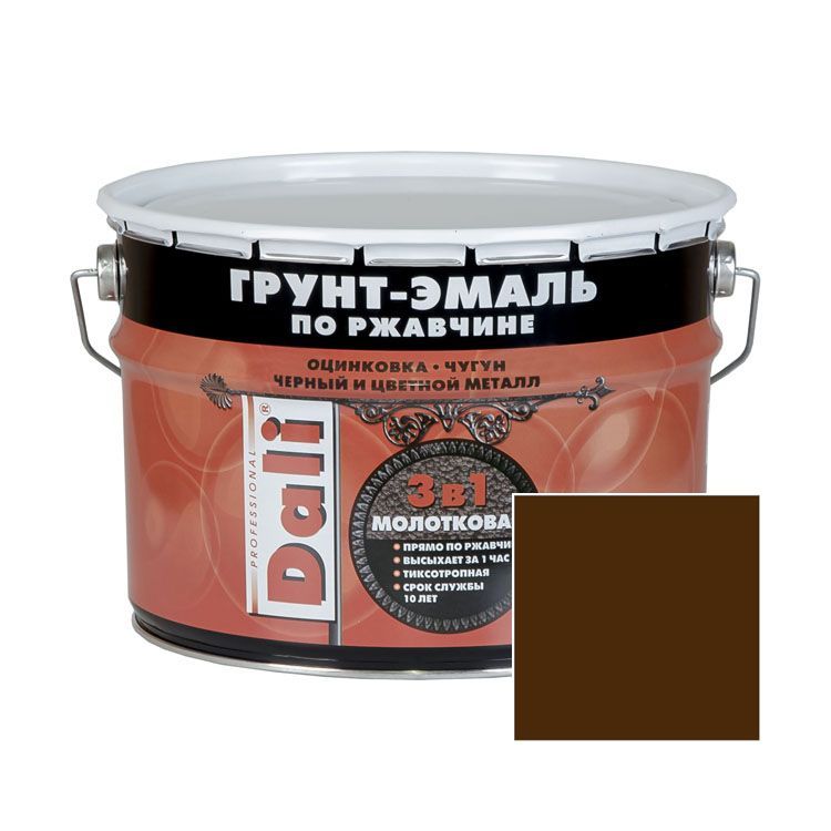 Защитная эмаль от ржавчины с эффектом молоткового рельефа. Устраняет коррозию, обеспечивает защиту от механических и химических повреждений, отталкивает влагу, грязь и УФ лучи, не выцветает, позволяет мыть поверхности. Подходит для применения в экстерьере и внутри помещений на всех видах металлов и оцинкованных поверхностей. Эмаль нетоксична, не имеет едкого запаха, высыхает на касание за 2-3 часа. Обладает глубоким шоколадно-коричневым цветом и переливается за счёт чеканного рельефа, благодаря чему изделия выглядят изящно и ухоженно. Легко наносится любым малярным инструментом, экономно расходуется, упруго обхватывая поверхность тонким слоем.