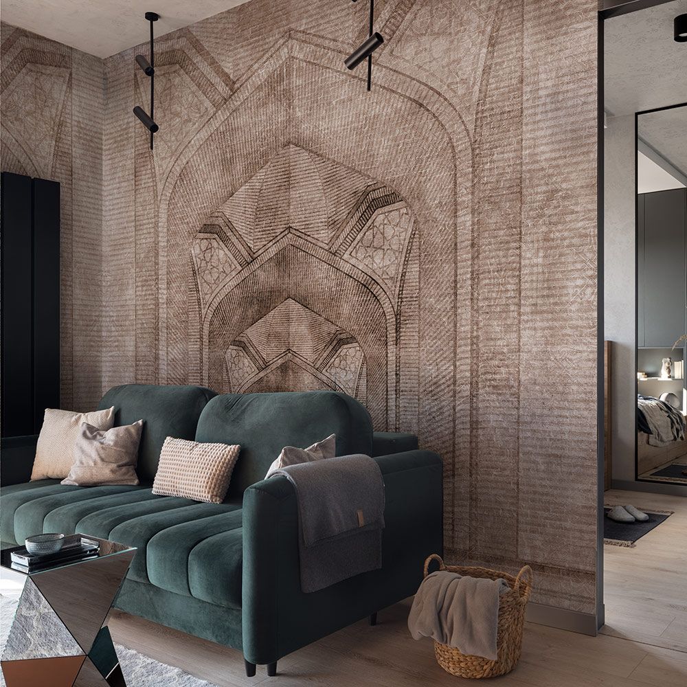 Обои ARCHWAY – интересный способ коррекции слишком вытянутых и узких помещений. Использование покрытия для широкого участка стены позволяет скрыть недостатки конфигурации комнаты, сделать обстановку комфортной и естественной.