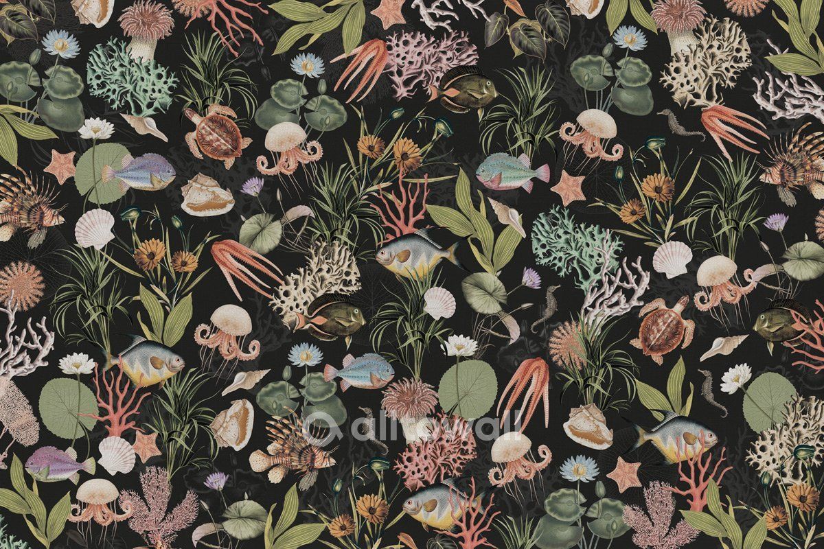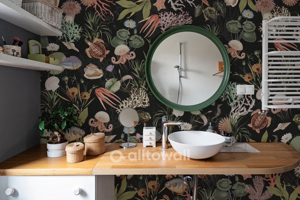 Сюжет с тёмным фоном и ярким паттерном в морской тематике. Обои «Атлантика» будут хорошо смотреться в ванной комнате, а также станут ярким акцентом кухни, холла или рабочего кабинета.