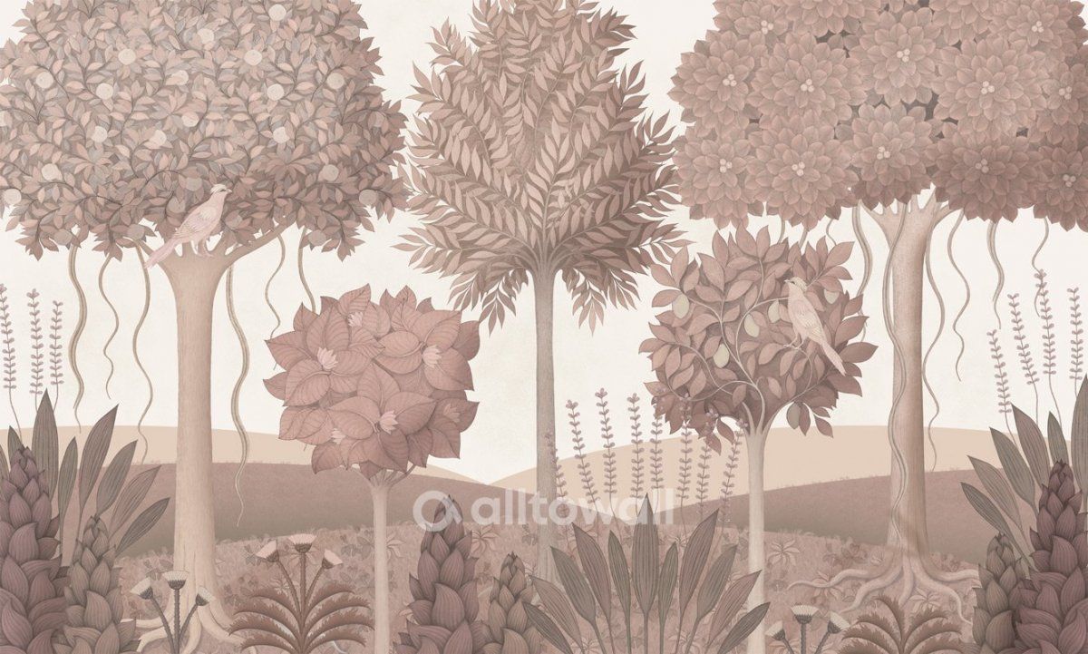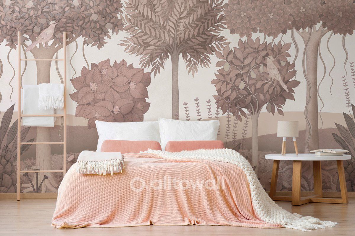 Бархатный сезон-2 – элегантная модель обоев для спальни, подходящая для комнаты подростка или родителей ребёнка. Сюжет выполнен на тему природы – это стилизованное изображение сада с мягкими тёплыми оттенками бежевого и приёмом горизонтального зонирования пространства. Такие обои помогут создать гармоничное настроение, обстановку, подходящую для умиротворяющего отдыха.