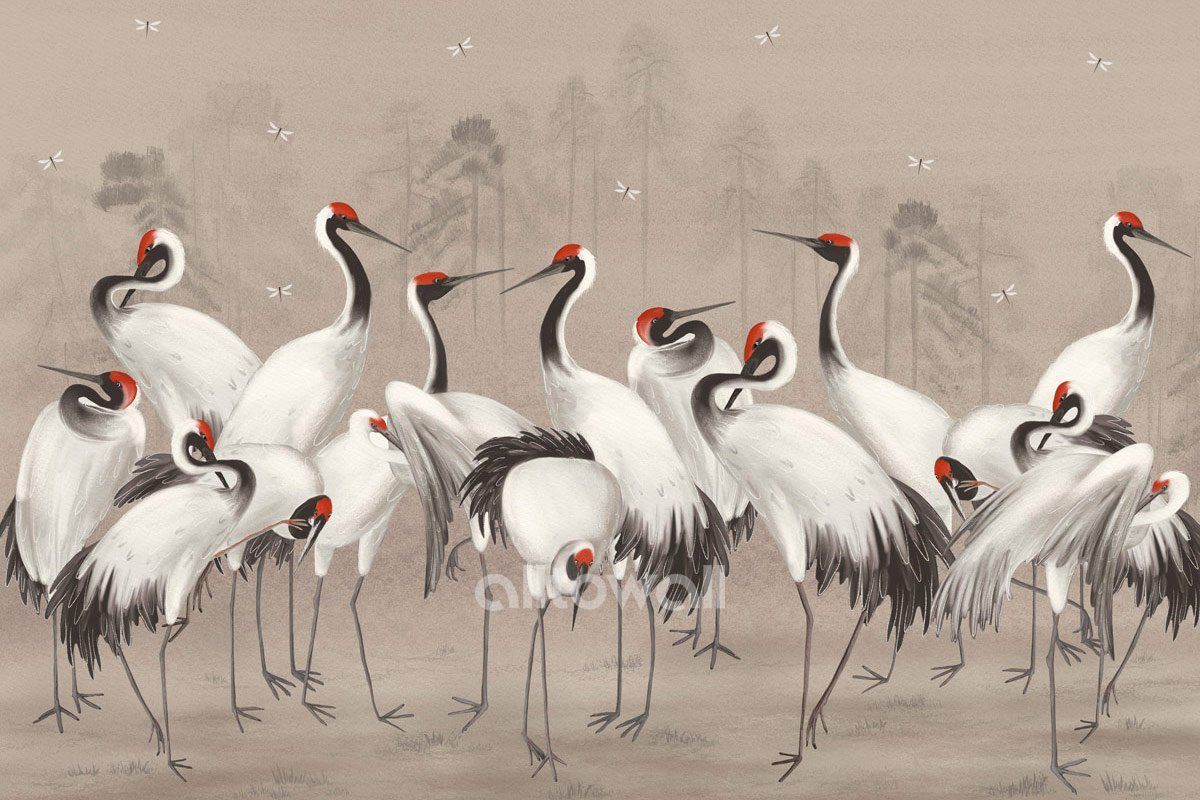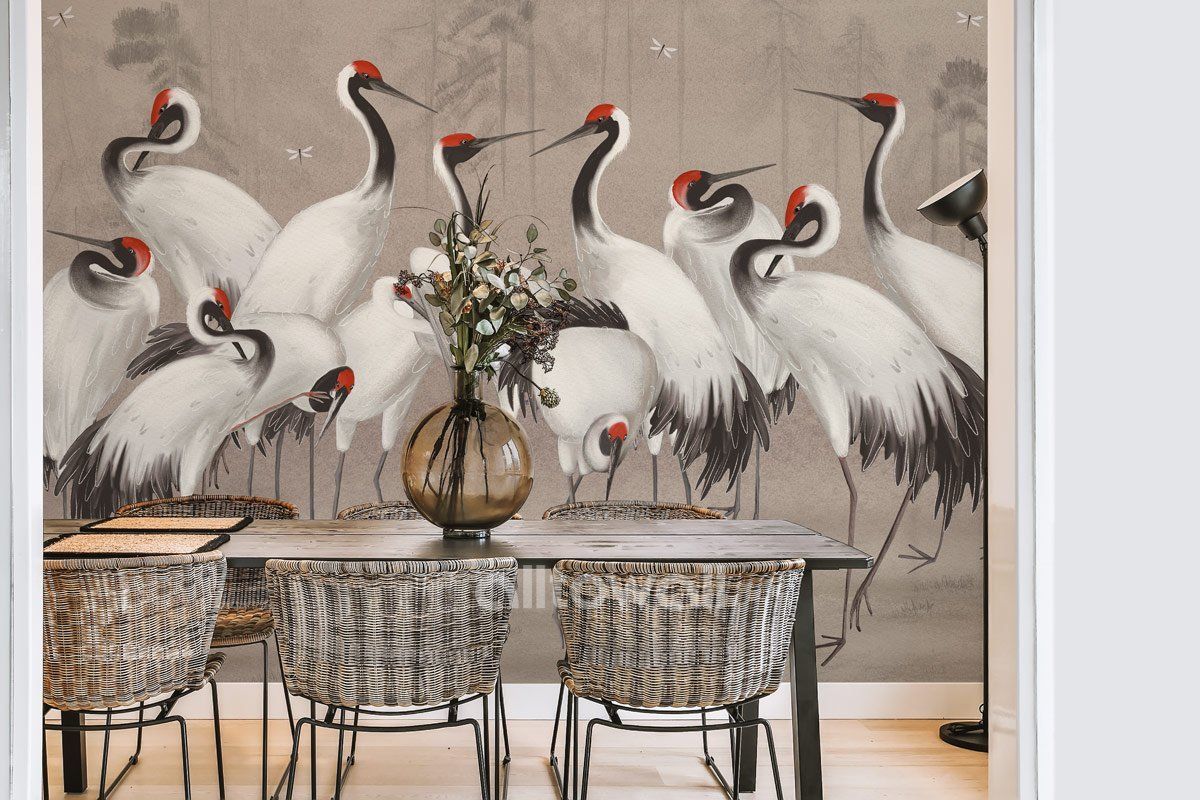Обои в светло-бежевой гамме с белыми журавлями, нарисованными в пастельной технике. Сюжет «Белые журавли-1» будет отлично смотреться в спальне, гостиной или кухне.