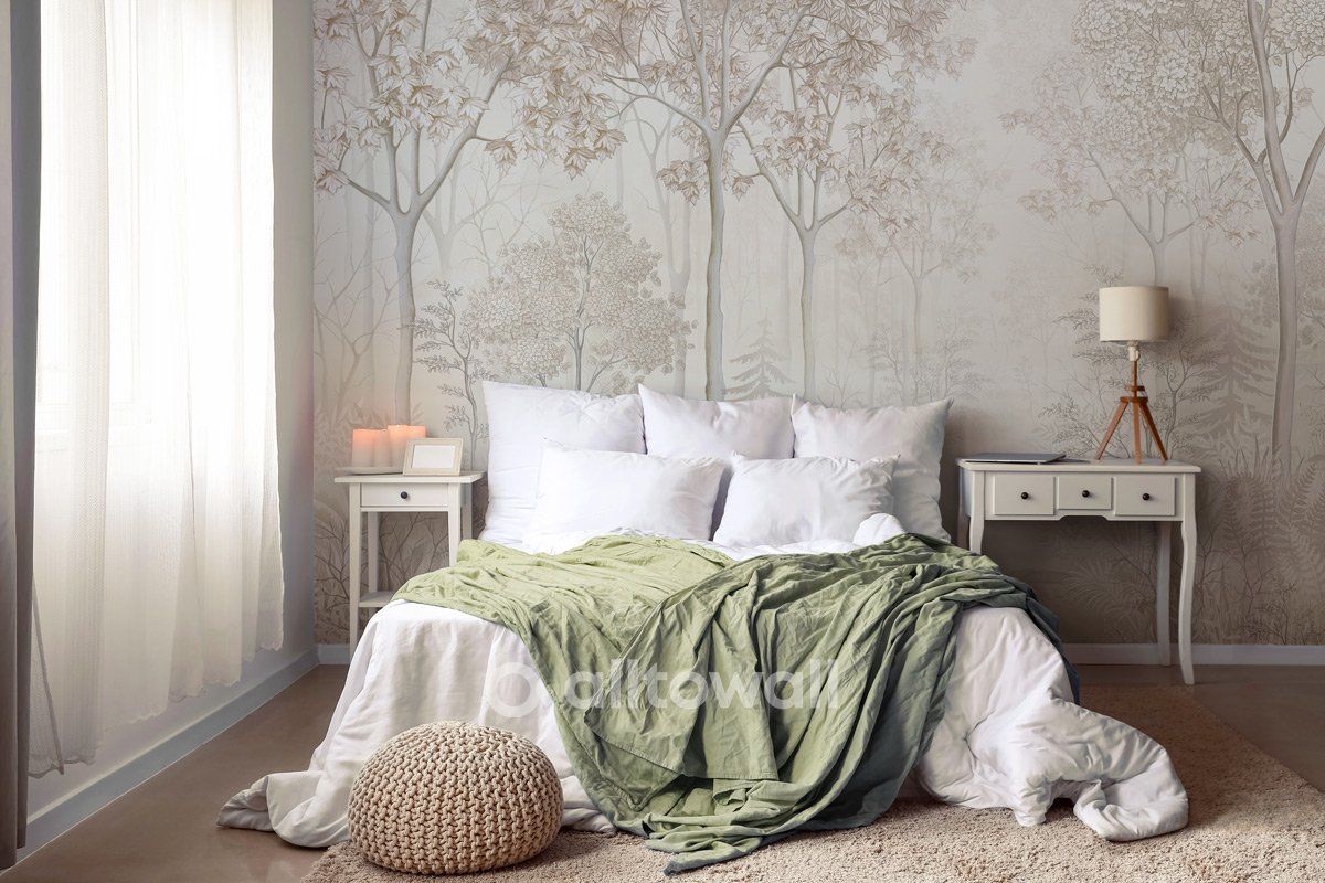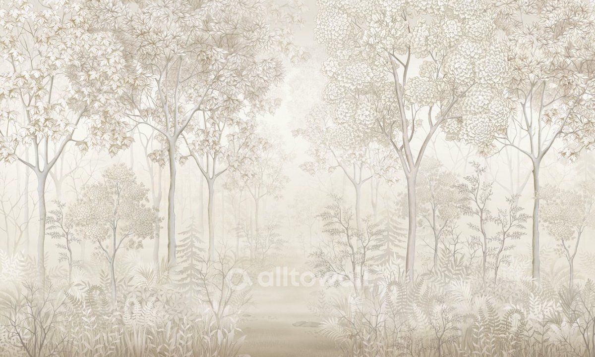 Нежный сюжет с деревьями в лёгкой бежевой дымке. «Бежевый лес» — обои в акварельной технике с красивым пейзажем.