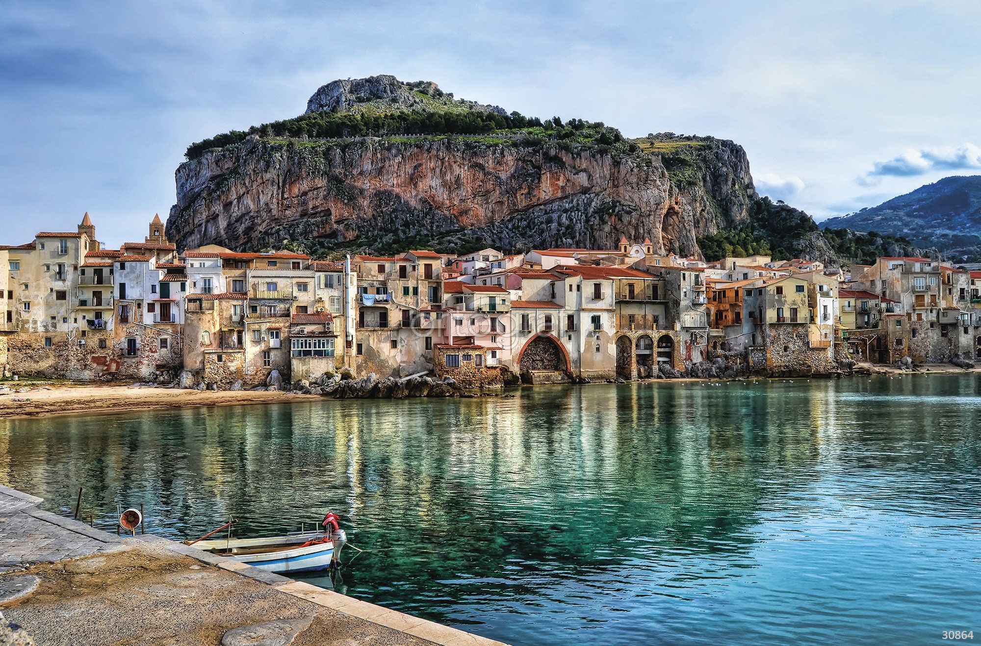 Архитектурный пейзаж с уютным старинным городом у воды, окружённым скалами и горами, создает атмосферу средиземноморской аутентичности и спокойствия. Такое изображение идеально для оформления современных пространств, где хочется добавить нотки уюта, истории и ощущения отпуска. Сюжет прекрасно расширяет пространство и наполняет его характером.
