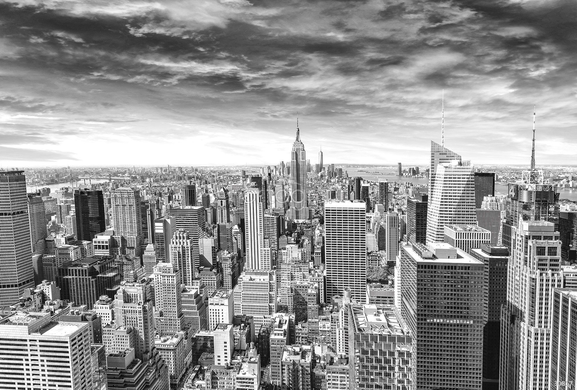 Панорамный черно-белый вид на мегаполис с высотными зданиями, центральным небоскребом и драматическим небом создает атмосферу ритма большого города, стиля и архитектурного совершенства. Такой сюжет добавляет интерьеру строгий характер, подчеркивает современность и визуально расширяет пространство.