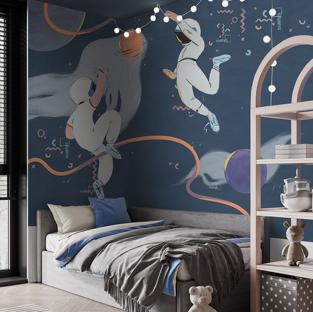 Основной сюжет – встреча двух поколений, космонавта, покоряющего космическое пространство, и подростка, который стремится к неведомым далям. Обои представлены с нескольких вариантах расцветок, особенности изображения делают покрытие идеальным для акцентного оформления пространства.