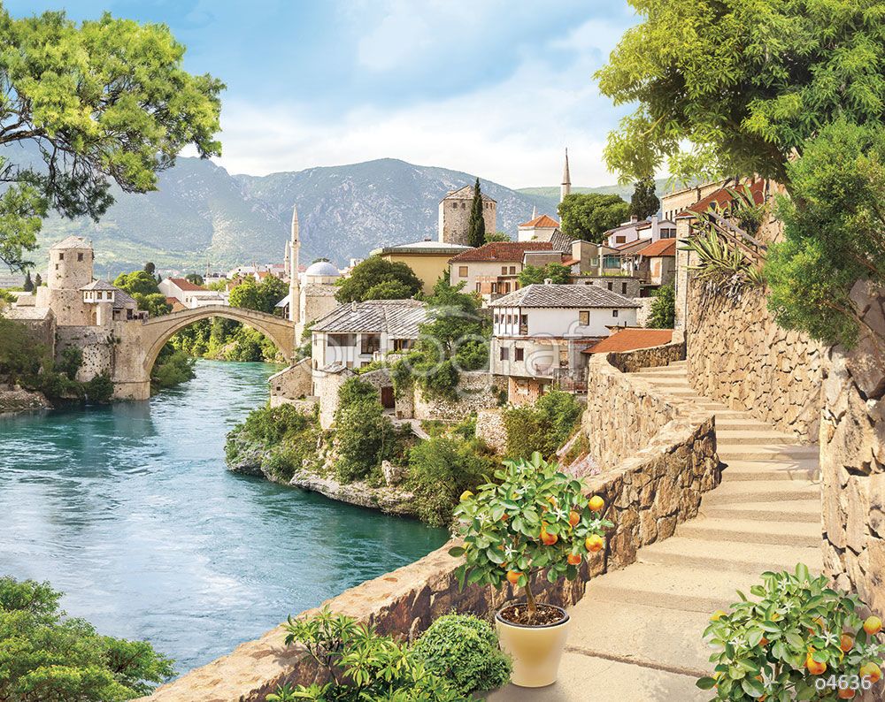Солнечный город на берегу реки с живописным мостом, горами вдали и уютными домиками создает атмосферу легкости и спокойствия. Такой сюжет идеально подойдет для оформления пространства в стиле отдыха и гармонии, привнося ощущение свежести и южной теплоты. Особенно уместен для обеденных зон, гостиных и прихожих.