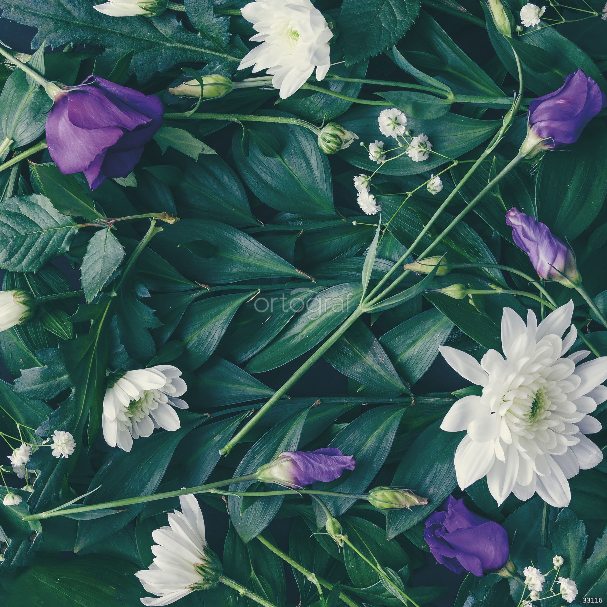 На изображении представлен флористический узор из сочных листьев с белыми и сиреневыми цветами, образующими гармоничную композицию. Такой рисунок создаёт атмосферу свежести, спокойствия и естественности, что подходит для современных интерьеров. Сюжет отлично дополняет оформление пространства, делая его более уютным и живым.