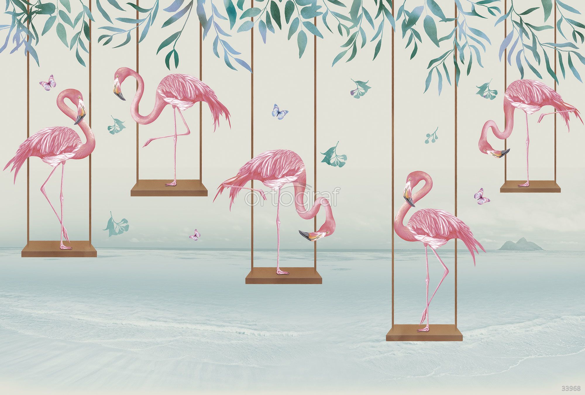 На изображении изображены фламинго, сидящие на качелях, с листьями и бабочками, что придает композиции легкость и игривость. Такой рисунок создает атмосферу уюта, фантазии и отлично подойдет для оформления детских комнат. Может быть интересным решением и для прихожей или кухни, если требуется добавить нотку беззаботности.