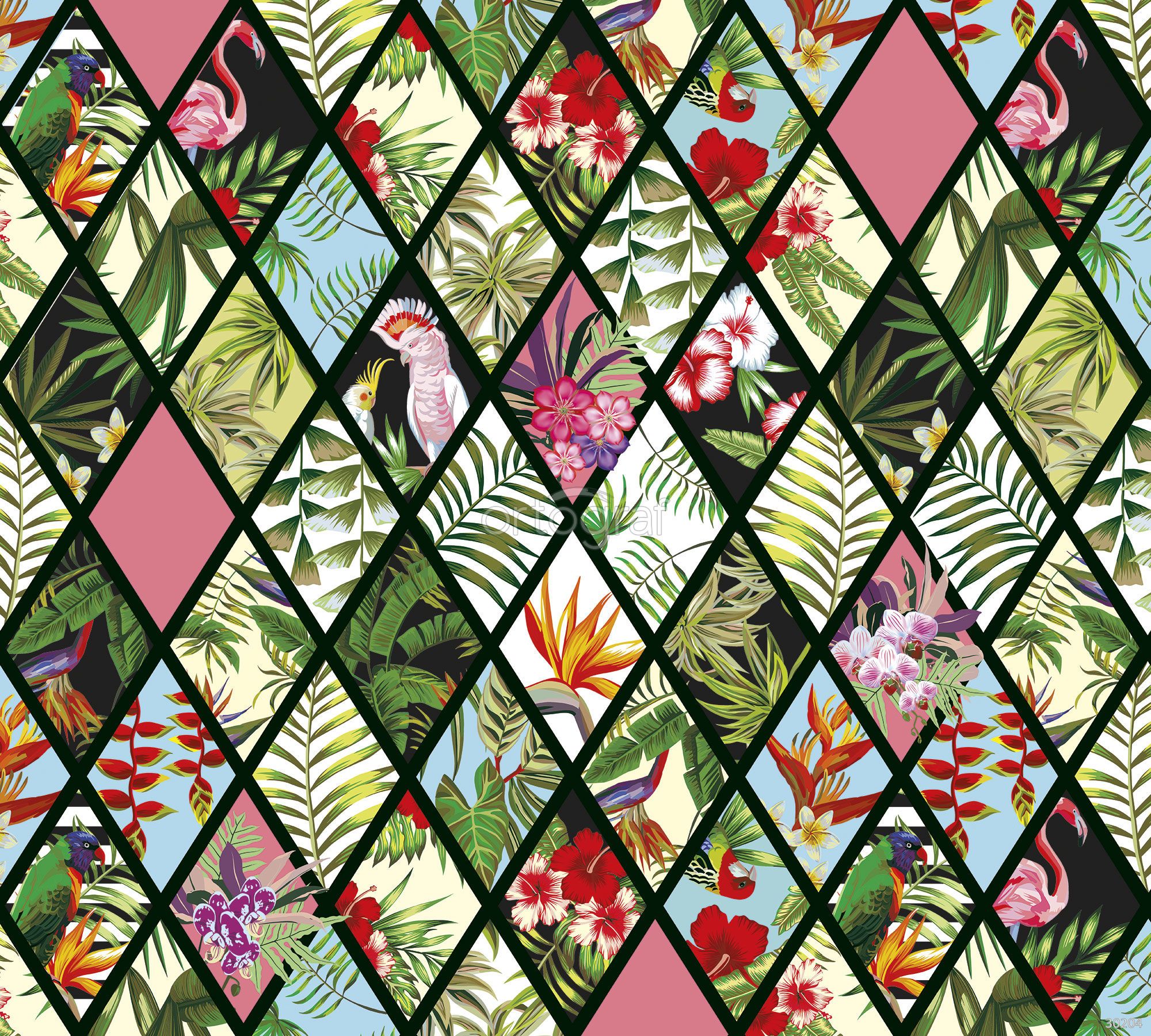 На изображении представлен декоративный тропический паттерн — ромбовидная сетка, каждое поле которой заполнено яркими композициями из экзотических растений и птиц. Внутри ромбов изображены крупные листья пальм, алые гибискусы, стрилиции, орхидеи, попугаи, фламинго и другие тропические мотивы, придающие узору ощущение пышной флоры и фауны. Фон паттерна выполнен в сочетании розовых, светлых и чёрных фрагментов, что добавляет динамики и современности композиции.