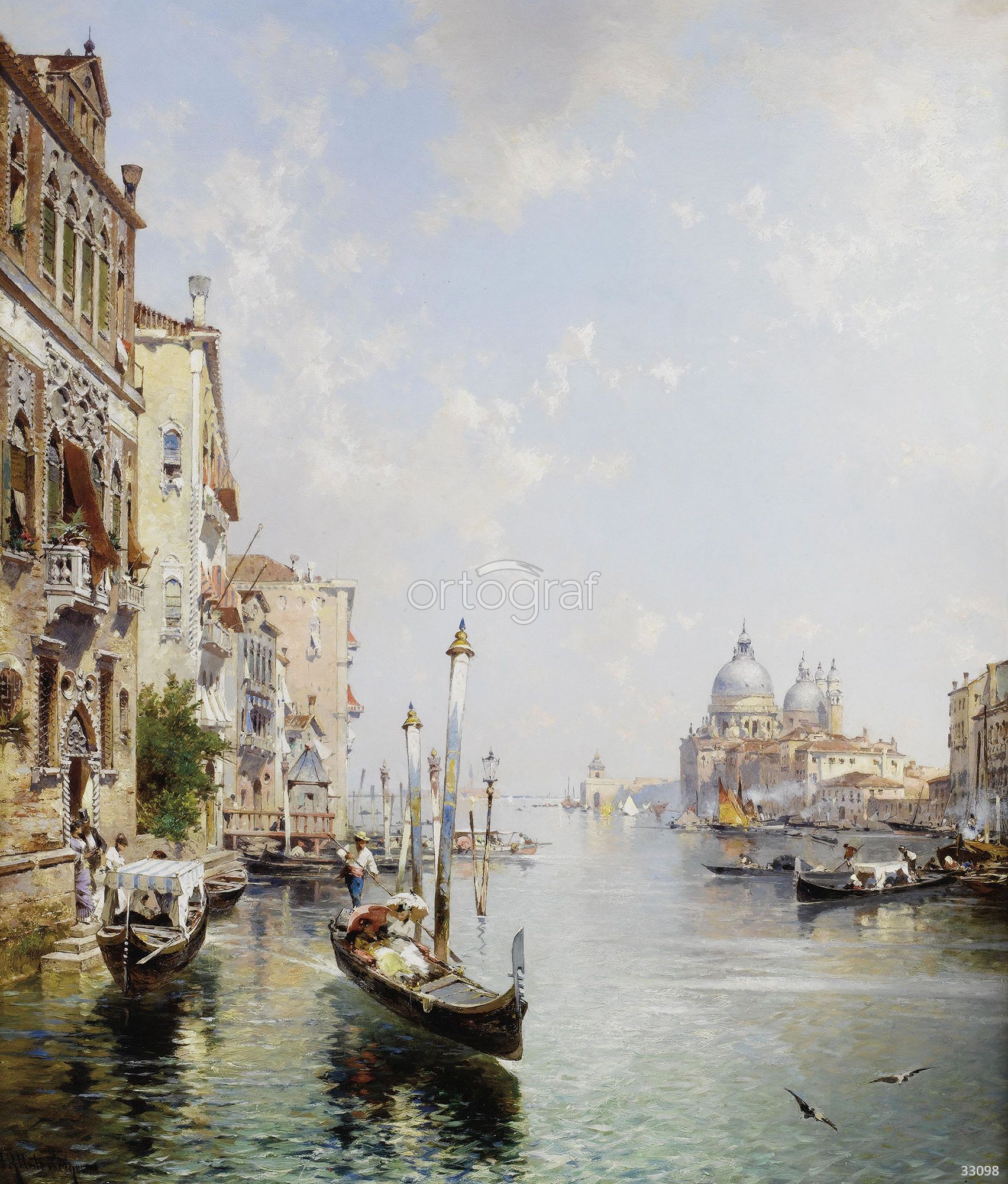 На изображении показан живописный вид Венеции с гондолами на канале, архитектурой старого города и куполами храма на заднем плане. Атмосфера сцены наполнена легкостью, романтикой и ощущением путешествия, благодаря спокойной воде и деталям городской жизни. Такой сюжет хорошо украсит интерьер, придавая ему элегантность и европейский шарм.