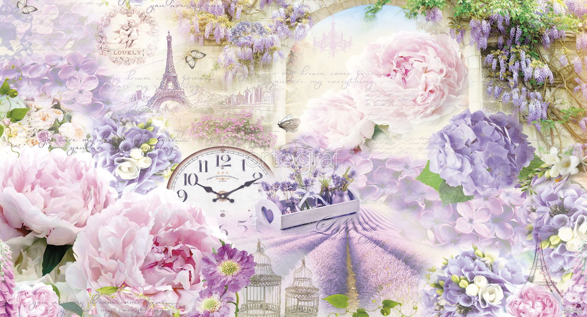 Романтичная композиция с крупными цветами, лавандовыми полями, винтажными часами, бабочками и силуэтами Парижа создает настроение нежности, мечтательности и французского Прованса. Такой сюжет придаёт помещению ощущение легкости, гармонии и уюта, прекрасно подходит для создания романтической атмосферы.