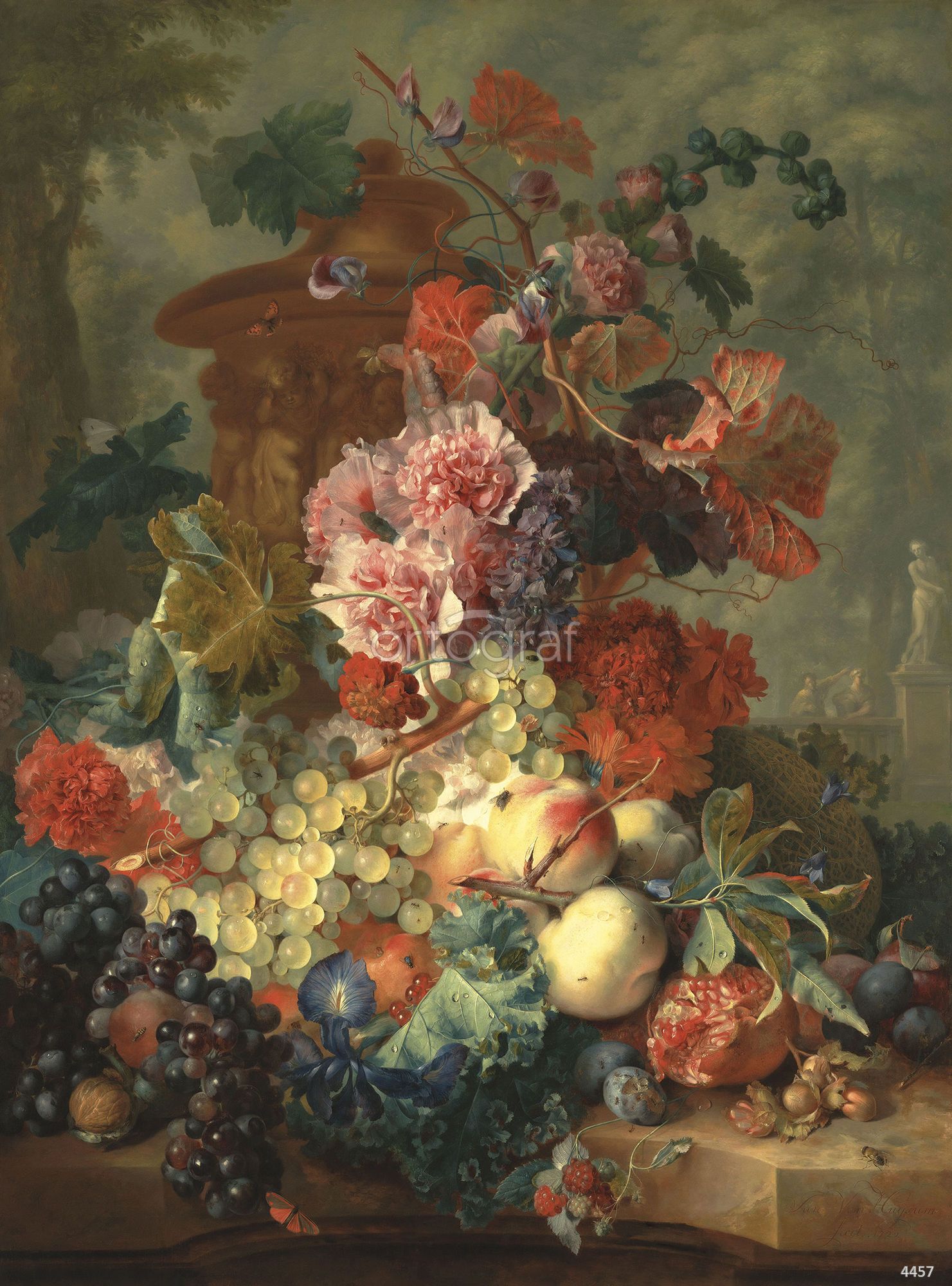 Картина с богатым натюрмортом из цветов, фруктов и винограда дарит ощущение уюта и роскоши. Композиция изобилует деталями и подойдет для классического интерьера, создавая атмосферу теплоты и элегантности. Такой сюжет лучше всего будет смотреться в обеденных зонах, гостиных или уютных уголках для отдыха. Особенно органично она впишется в помещение с традиционной мебелью и акцентом на эстетику.