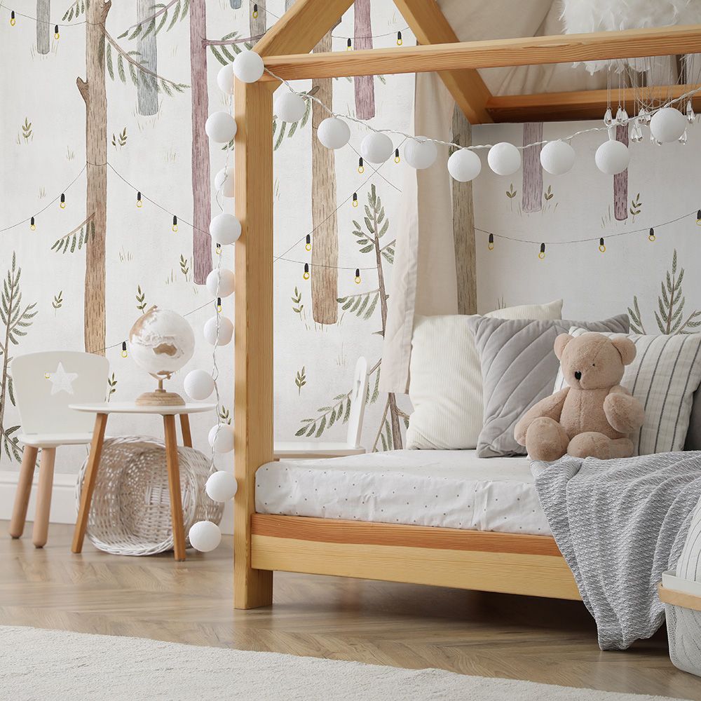 GARLAND – идеальное решение для комнаты ребенка. Стилизованное изображение леса, использование скандинавского стиля и спокойной гаммы делает покрытия лучшим выбором для гармоничной обстановки. Дизайн отличается необычным решением – между стволами деревьев натянуты гирлянды, которые словно светятся теплым желтым светом.