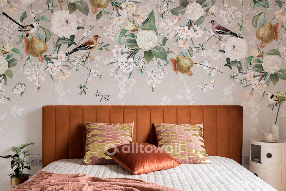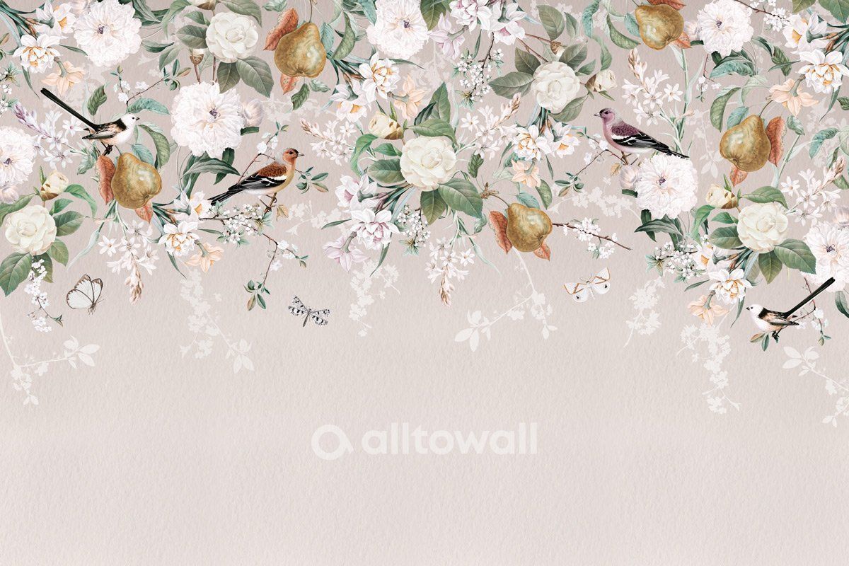 Грушевые деревья, нежные цветы, порхающие бабочки и изящные птицы. «Грушевый сад» — романтичные обои в нежных пастельных тонах для спальни, гостиной и комнаты подростка.
