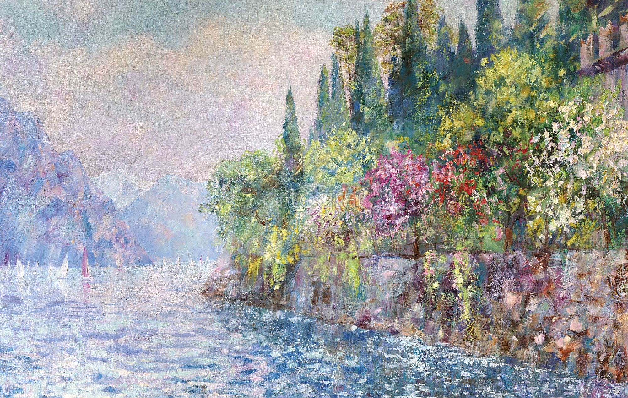 Живописный вид на горное озеро с цветущим садом и корабликами создает атмосферу спокойствия, отдыха и южного уюта Такой сюжет отлично дополнит интерьер, добавив нотки природы, гармонии и свежих впечатлений Особенно подходит для светлых, просторных помещений