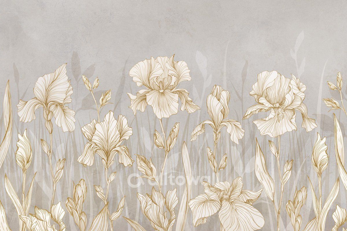Обои в приглушённых серо-бежевых тонах с нежными бутонами. «Изящные ирисы-2» — сюжет с имитацией фрески для спальни или гостиной в стиле новой классики.