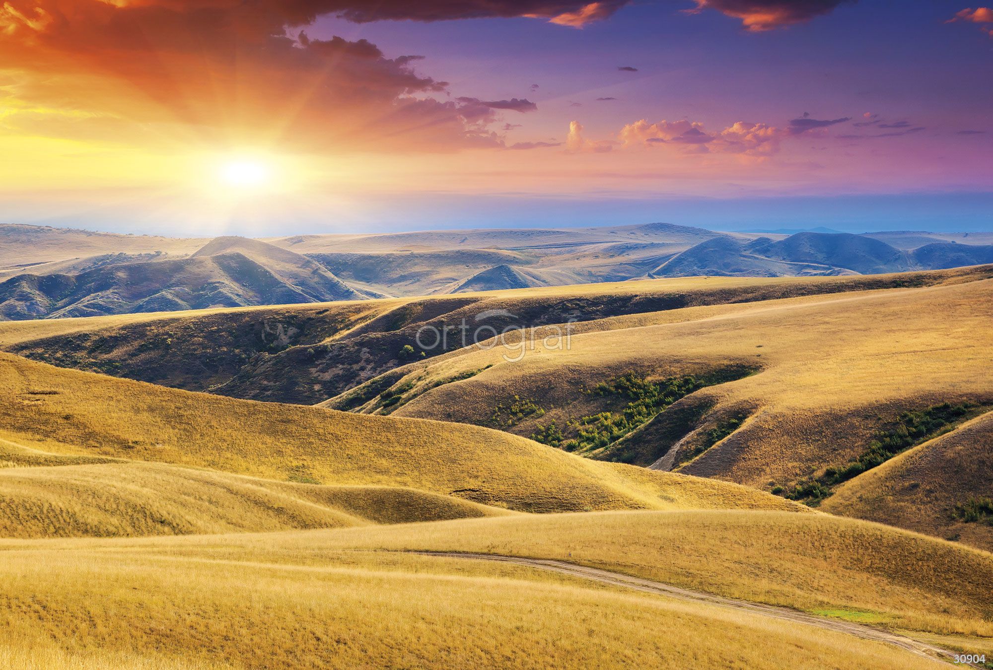Мягкий и просторный пейзаж с волнистыми полями, уходящими к горизонту, и ярким закатом создает атмосферу спокойствия и тепла. Такой сюжет отлично подойдет для интерьера, которому требуется ощущение простора и гармонии с природой. Он визуально расширяет стены и придает помещению уют и мягкий свет.