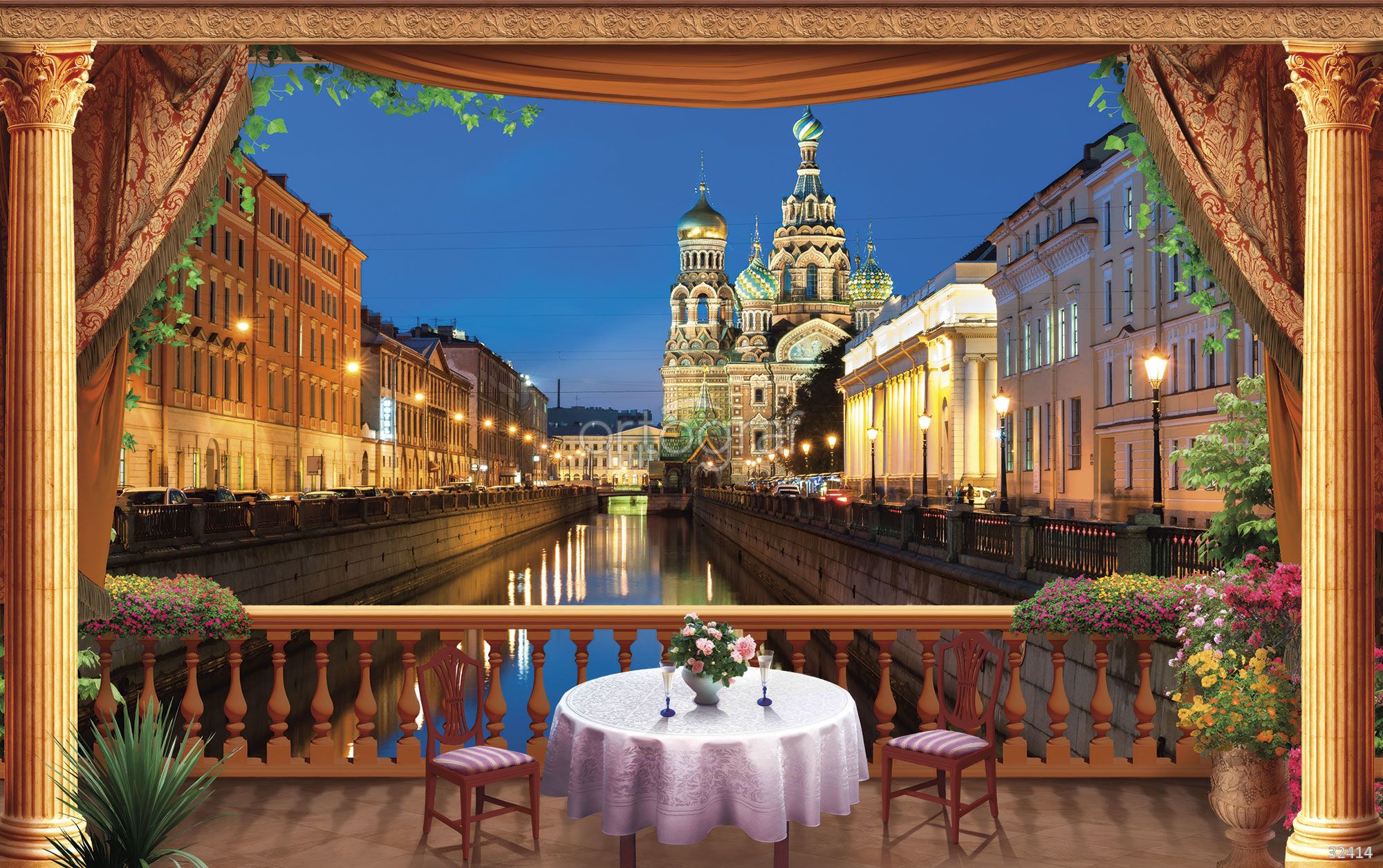 На изображении открывается вид на городской канал и знаменитый собор в центре Санкт-Петербурга, украшенный ночным освещением. Передний план оформлен как балкон с классическими колоннами, пышными цветами и накрытым столом для романтического ужина, что создаёт атмосферу праздника и уюта.