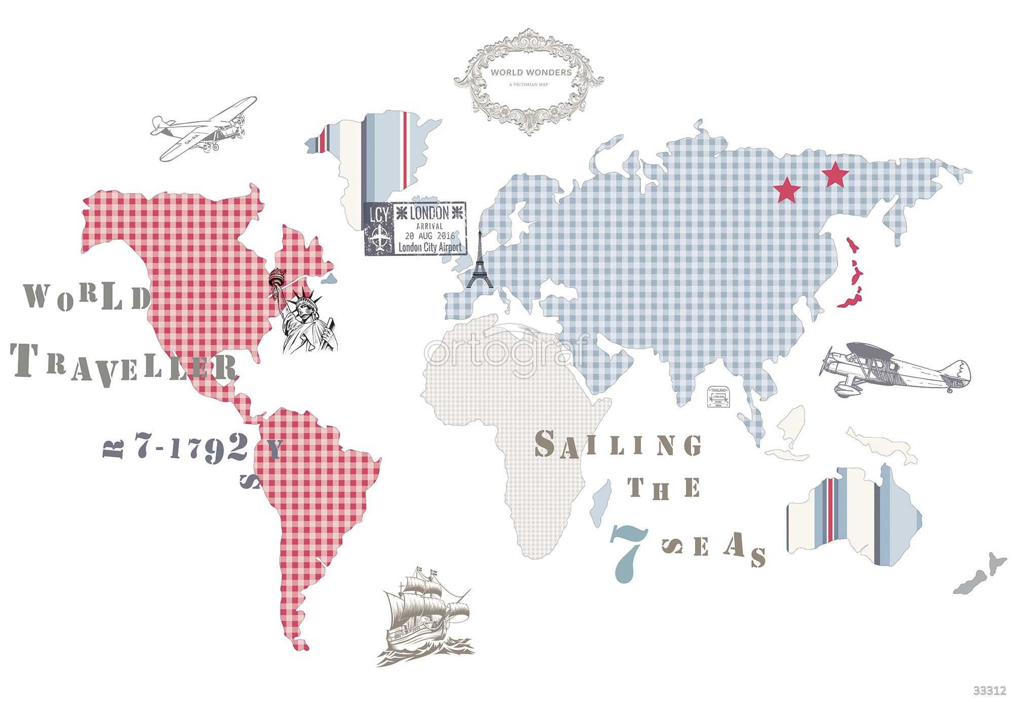 Стилизованная карта мира с рисунками самолетов, корабля, Свободы и Эйфелевой башни, а также декоративными надписями и штампами, создаёт атмосферу путешествий и открытий. Геометрические узоры напоминают о тематике приключений, вдохновляют к исследованиям и идеально подходят для образовательного или игрового пространства. Такой сюжет добавит творческий и мотивирующий акцент.