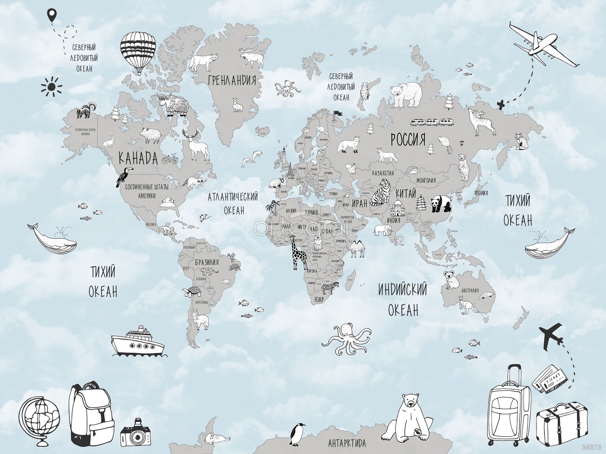 На изображении представлена стилизованная карта мира с континентами, подписями стран и океанов, а также с изображениями животных, транспорта и географических особенностей. Такой сюжет отлично подходит для создания образовательной и вдохновляющей атмосферы, он способствует развитию интереса к путешествиям и познанию мира. Иллюстрация универсальна и легко впишется в пространство, где важны обучение и расширение кругозора.