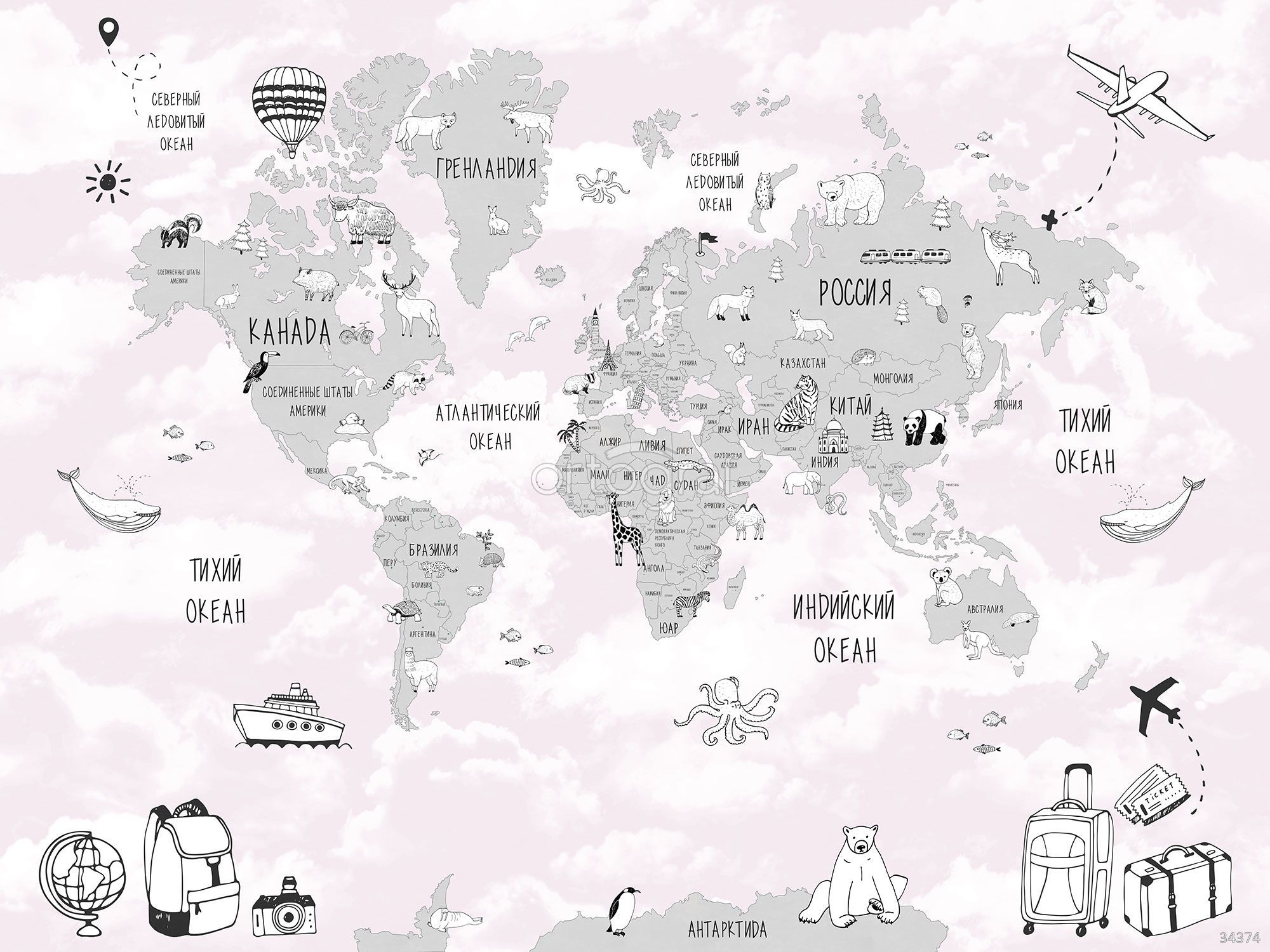 На изображении представлена стилизованная карта мира с континентами, подписями стран и океанов, а также с изображениями животных, транспорта и географических особенностей. Такой сюжет отлично подходит для создания образовательной и вдохновляющей атмосферы, он способствует развитию интереса к путешествиям и познанию мира. Иллюстрация универсальна и легко впишется в пространство, где важны обучение и расширение кругозора.