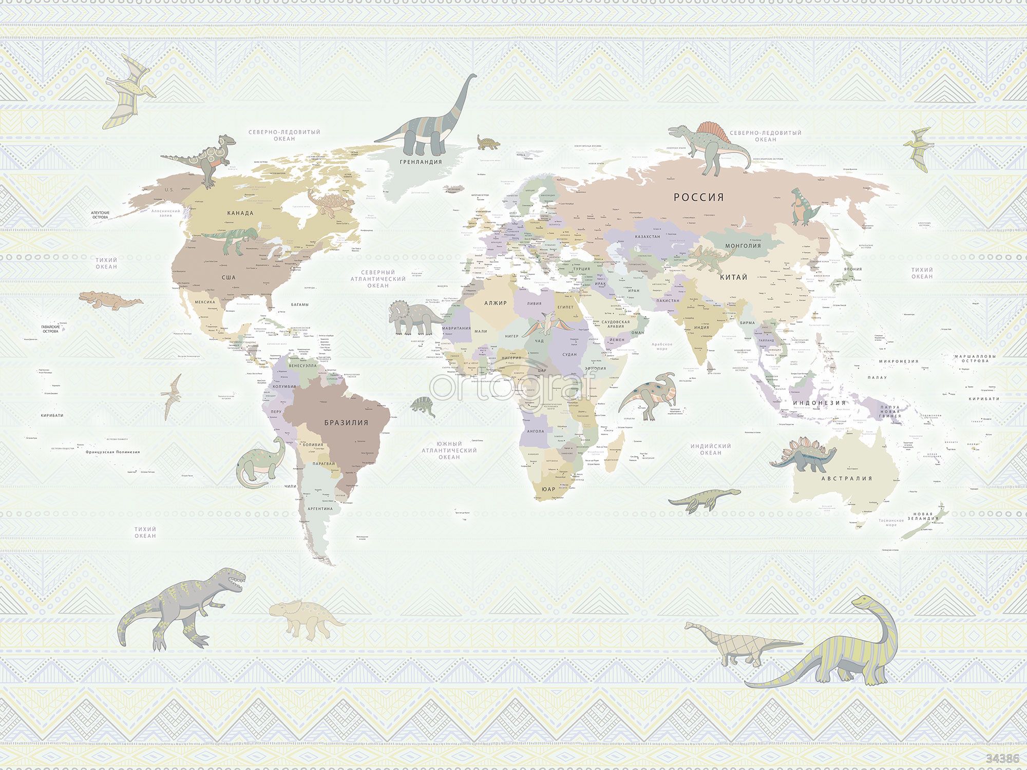 На этом изображении представлена карта мира с географическими подписями и изображениями различных динозавров, размещённых по всему земному шару. Иллюстрация украшена этническим орнаментом и идеально подходит для создания познавательной и креативной атмосферы в интерьере, пробуждая интерес к истории древнего мира и исследованию Земли. Сюжет отлично впишется в игровое и образовательное пространство.