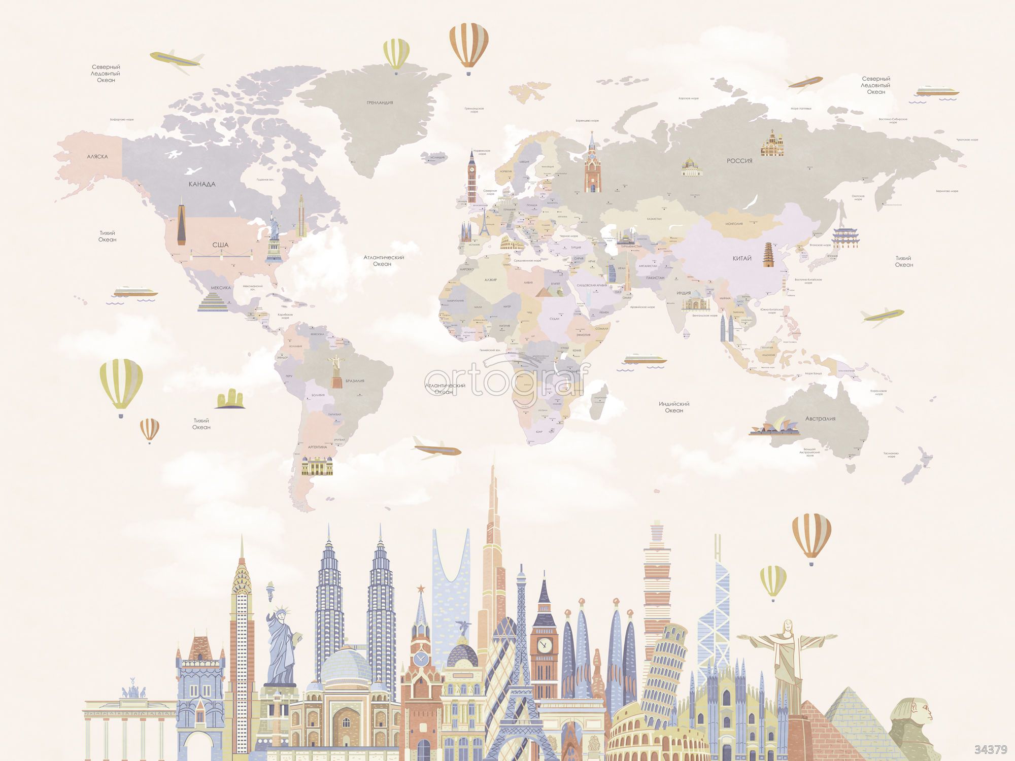 На изображении представлена карта мира, дополненная крупными архитектурными достопримечательностями разных стран, воздушными шарами, самолётами и кораблями. Иллюстрация создает атмосферу путешествий и знакомства с культурой мира, отлично подходит для пространства, стимулирующего интерес к разным странам и архитектуре. Такой сюжет гармонично впишется и в образовательную, и в современную интерьерную среду.