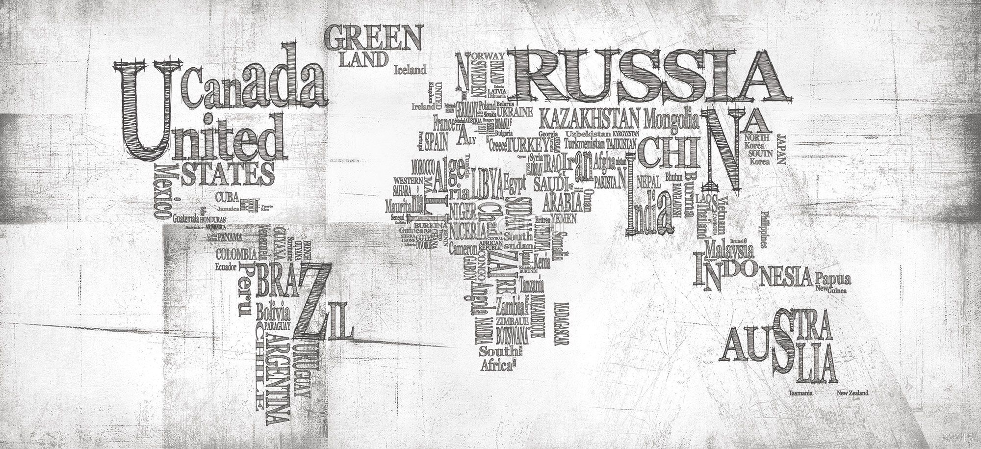 Карта мира, построенная из названий стран разного размера и формы, создает стильный и лаконичный акцент для современного интерьера. Такой подход визуально подчеркивает географические особенности через типографику и отлично впишется в образовательное или рабочее пространство. Это решение добавит оригинальности и информативности в оформление помещения.