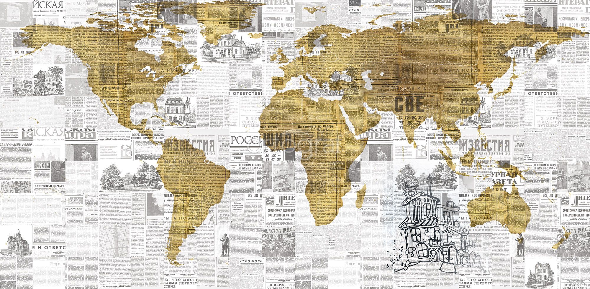 На изображении показана карта мира, очертания всех континентов нанесены золотистым цветом поверх коллажа из газетных страниц на русском языке. В правой нижней части виден стилизованный рисунок дома среди деревьев, а фон состоит из исторических газет с заметками, фотографиями и иллюстрациями, создавая эффект винтажного оформления.