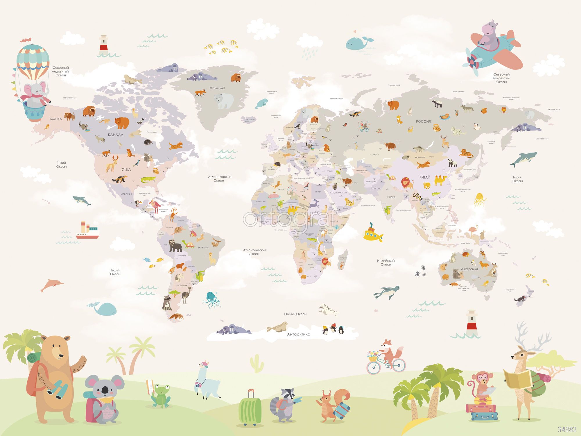 Весёлая сюжетная карта мира с иллюстрированными животными континентов, воздушным шаром, самолётом, кораблями и забавными зверятами-путешественниками на переднем плане. Такая композиция формирует увлекательное пространство для изучения природы, географии и животных, вдохновляя на фантазию и открытия. Отлично подойдёт для оформления познавательных и игровых интерьеров.