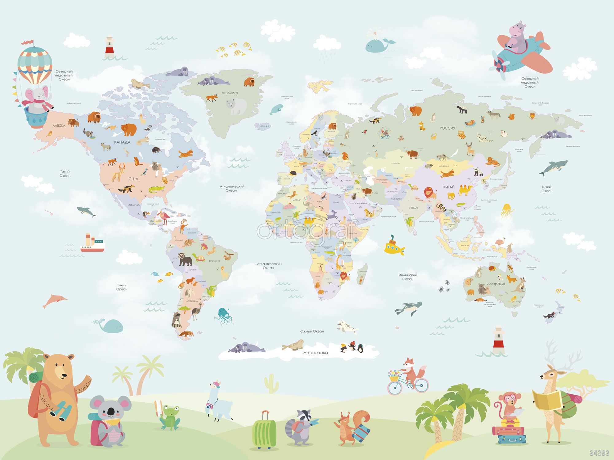 Весёлая сюжетная карта мира с иллюстрированными животными континентов, воздушным шаром, самолётом, кораблями и забавными зверятами-путешественниками на переднем плане. Такая композиция формирует увлекательное пространство для изучения природы, географии и животных, вдохновляя на фантазию и открытия. Отлично подойдёт для оформления познавательных и игровых интерьеров.