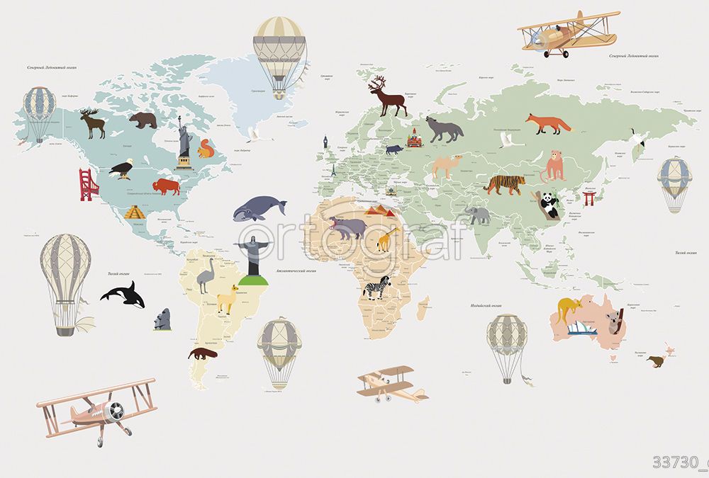 Познавательная карта мира с животными, знаменитыми достопримечательностями, самолетами и воздушными шарами помогает детям знакомиться с географией и особенностями континентов. Такой рисунок делает интерьер веселым и стимулирует интерес к изучению мира, отлично впишется в детскую комнату или учебную зону. Композиция создаёт атмосферу путешествий и приключений.