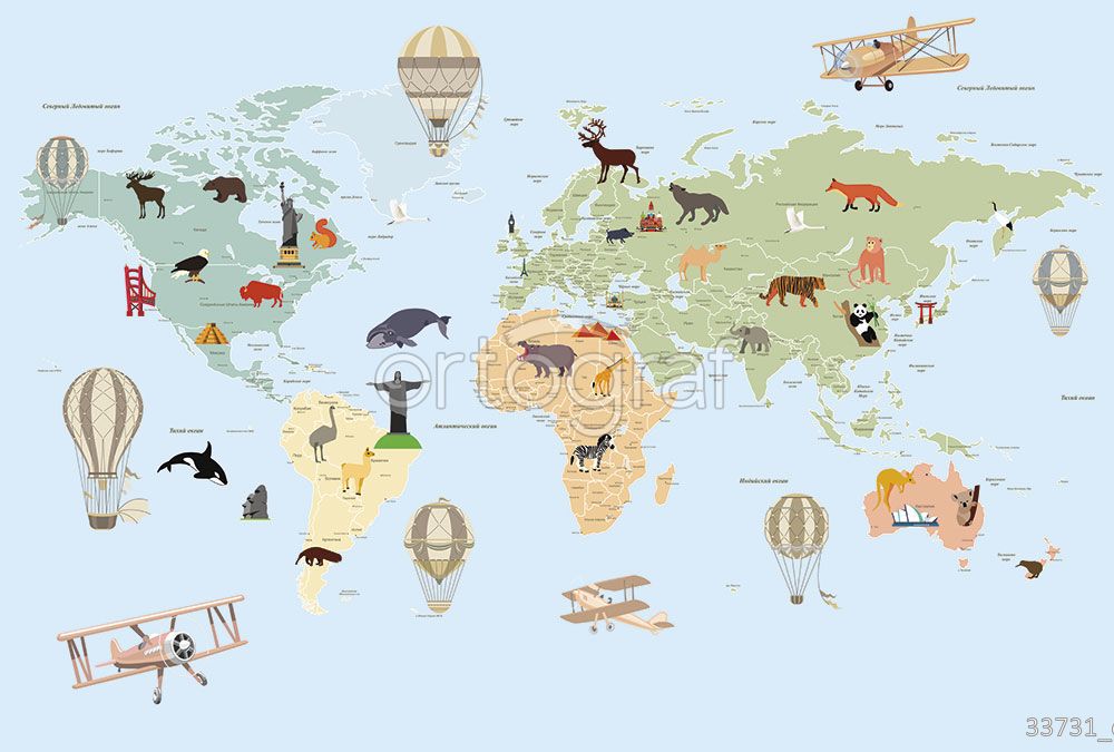 Познавательная карта мира с животными, знаменитыми достопримечательностями, самолетами и воздушными шарами помогает детям знакомиться с географией и особенностями континентов. Такой рисунок делает интерьер веселым и стимулирует интерес к изучению мира, отлично впишется в детскую комнату или учебную зону. Композиция создаёт атмосферу путешествий и приключений.