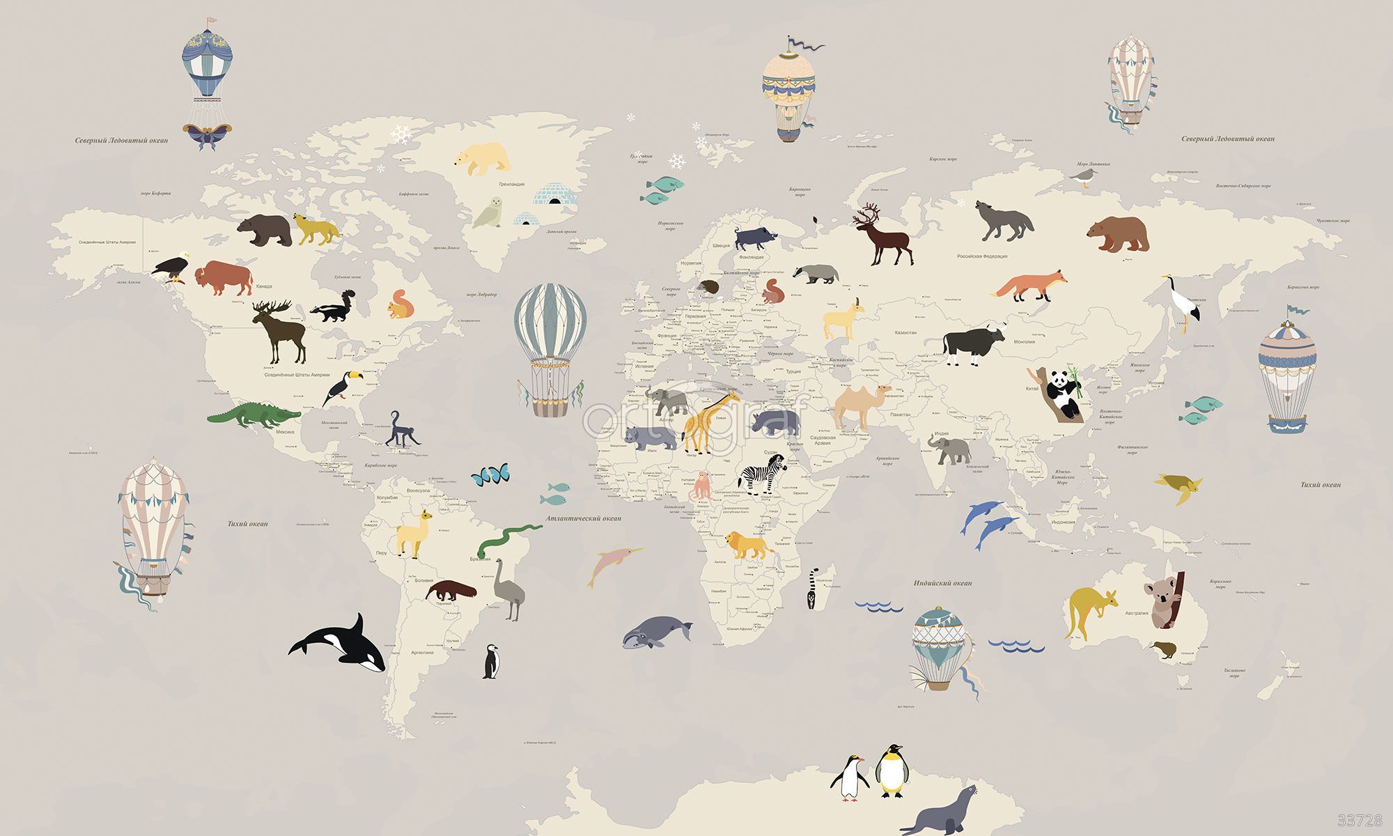 Яркая карта мира с изображениями животных, характерных для разных континентов, а также с элементами воздушных шаров и морских обитателей, создает познавательную и увлекательную атмосферу. Такой рисунок помогает познакомиться с географией и фауной планеты, отлично подойдёт для детской комнаты или учебной зоны. Композиция развивает интерес к миру и украсит образовательное пространство.