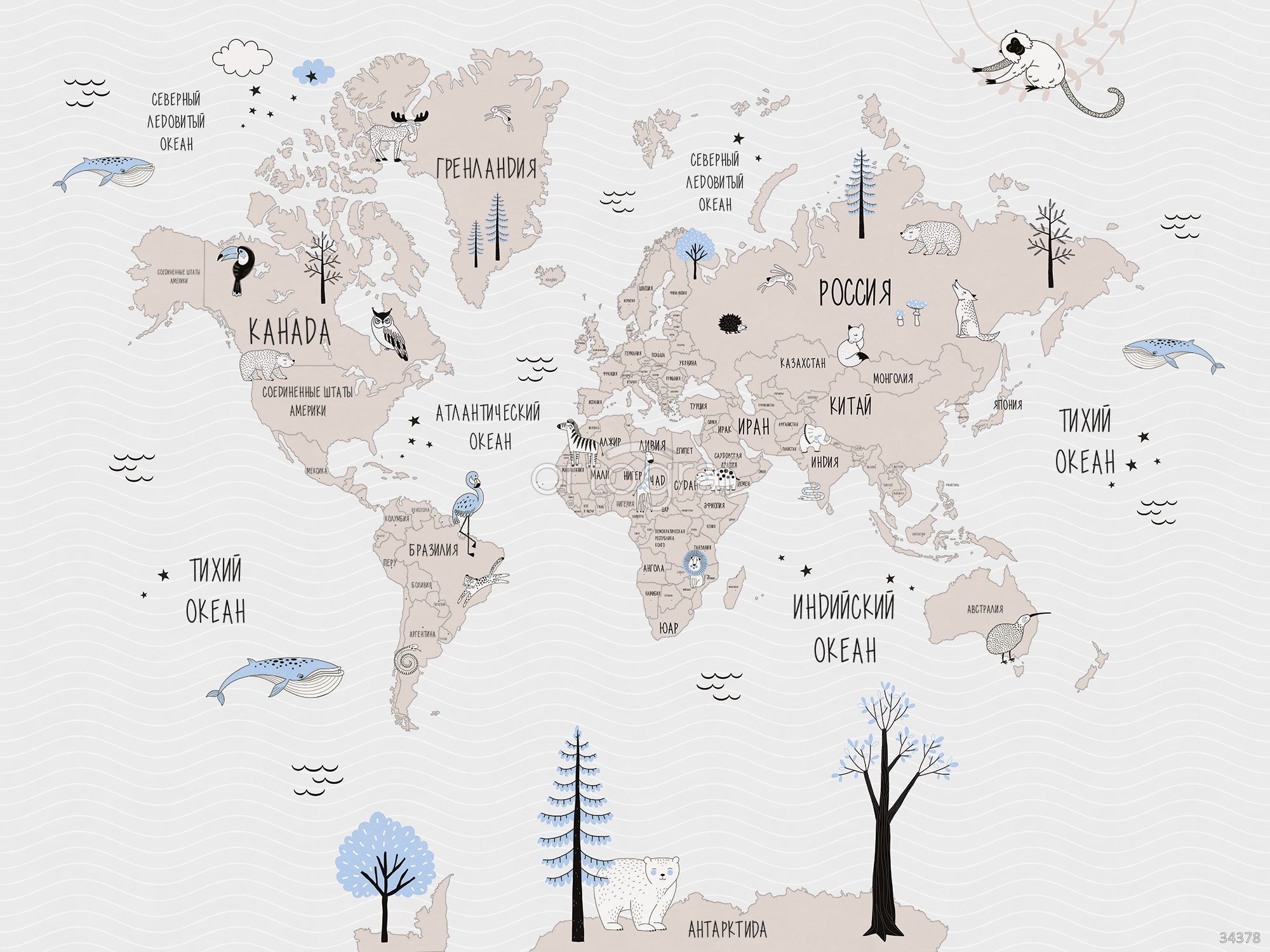 На изображении — стилизованная карта мира с географическими подписями, континентами, океанами, а также характерными животными и деревьями для каждого региона. Иллюстрация оформлена с элементами природы, что делает её интересной для изучения окружающего мира и создания мотивации к путешествиям. Такой сюжет хорошо подойдёт в образовательные и современные пространства.