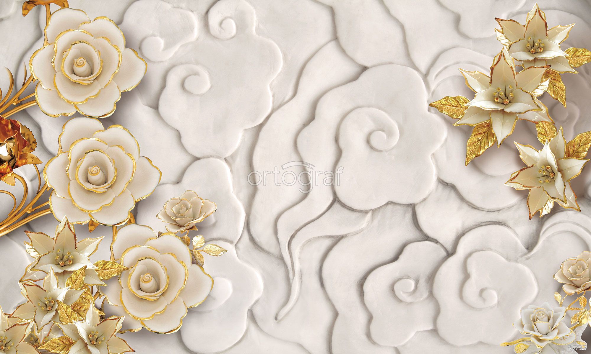 Стильная композиция с объемными кругами, розами и декоративными завитками создает настроение легкости, уюта и романтики. Такой рисунок подойдет для акцента в современном или классическом интерьере, визуально расширяет пространство и добавляет изысканный флористический акцент.