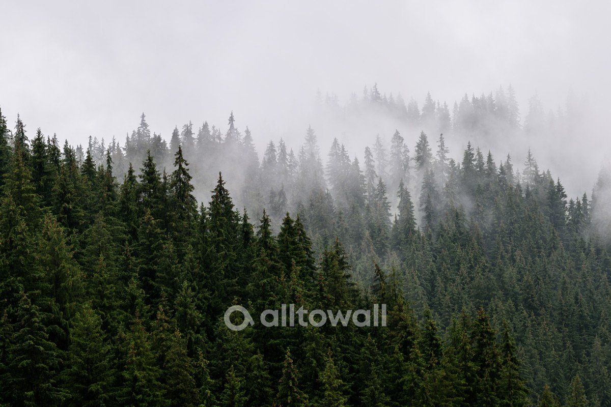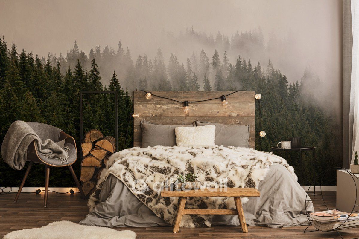 Обои для спальни или гостиной в насыщенных тёмно-зелёных тонах с реалистичными деревьями. «Хвойные вершины» — сюжет для настоящих ценителей природы.