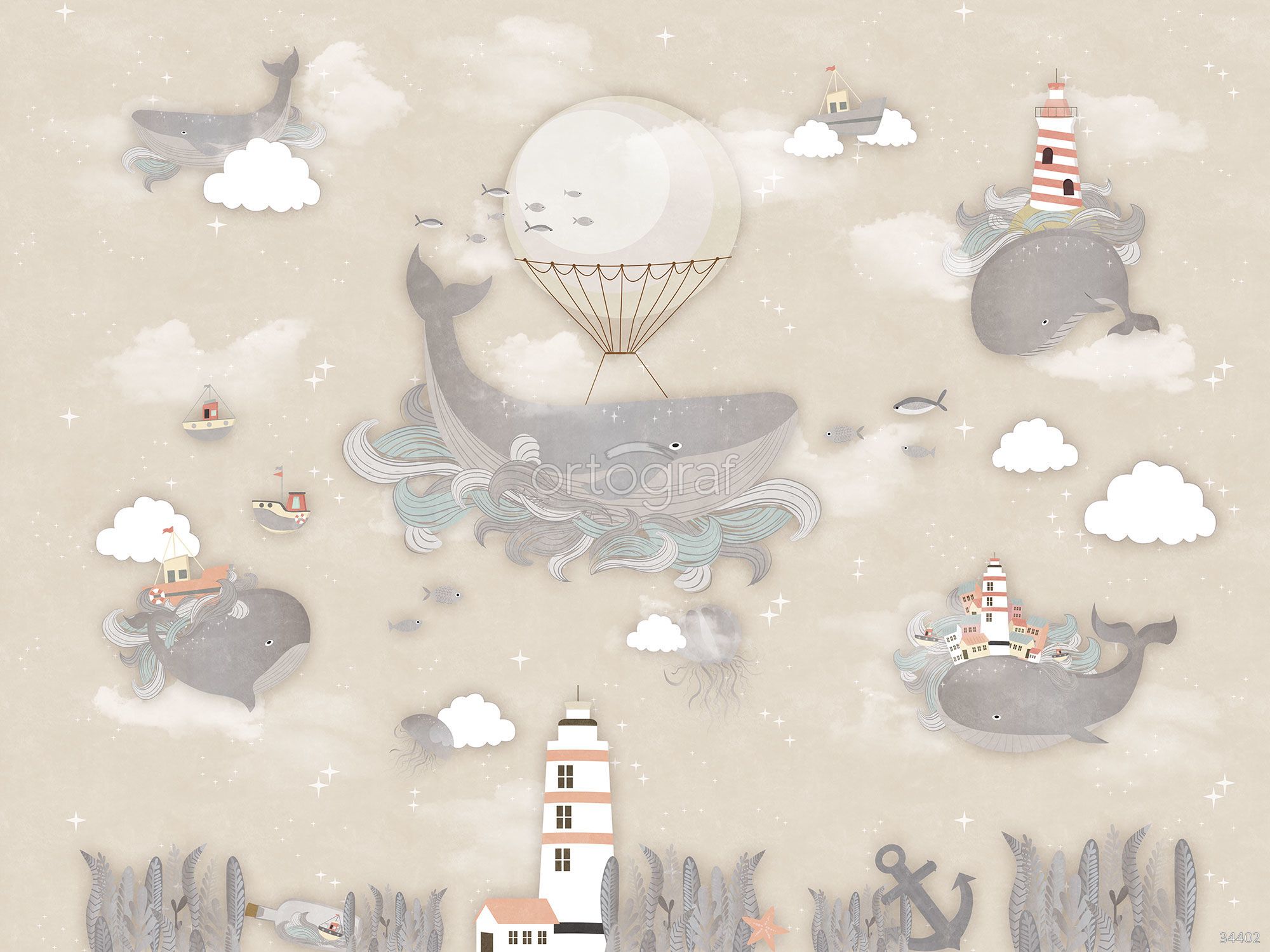 Сюжет выполнен в морском стиле: среди звездного неба и облаков плавают киты с маяками, лодками, домиками и воздушным шаром. Иллюстрация создает ощущение сказочного водного мира, мира приключений и мечты в морской тематике. Такая работа будет отлично смотреться в интерьере, где хотят добавить атмосферу фантазии и путешествий.