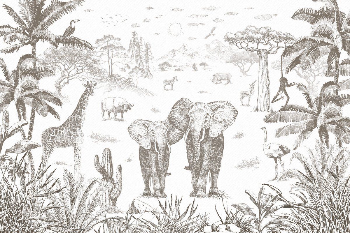 Книга джунглей – обои, посвящённые загадочной африканской саванне. Это двухцветная модель, изображения которой показывают растительный и животный мир южного континента. Для рисунка используется необычная техника карандашного наброска, что делает обои идеальным вариантом в качестве фона для игровой зоны, у кровати ребёнка или для декора.