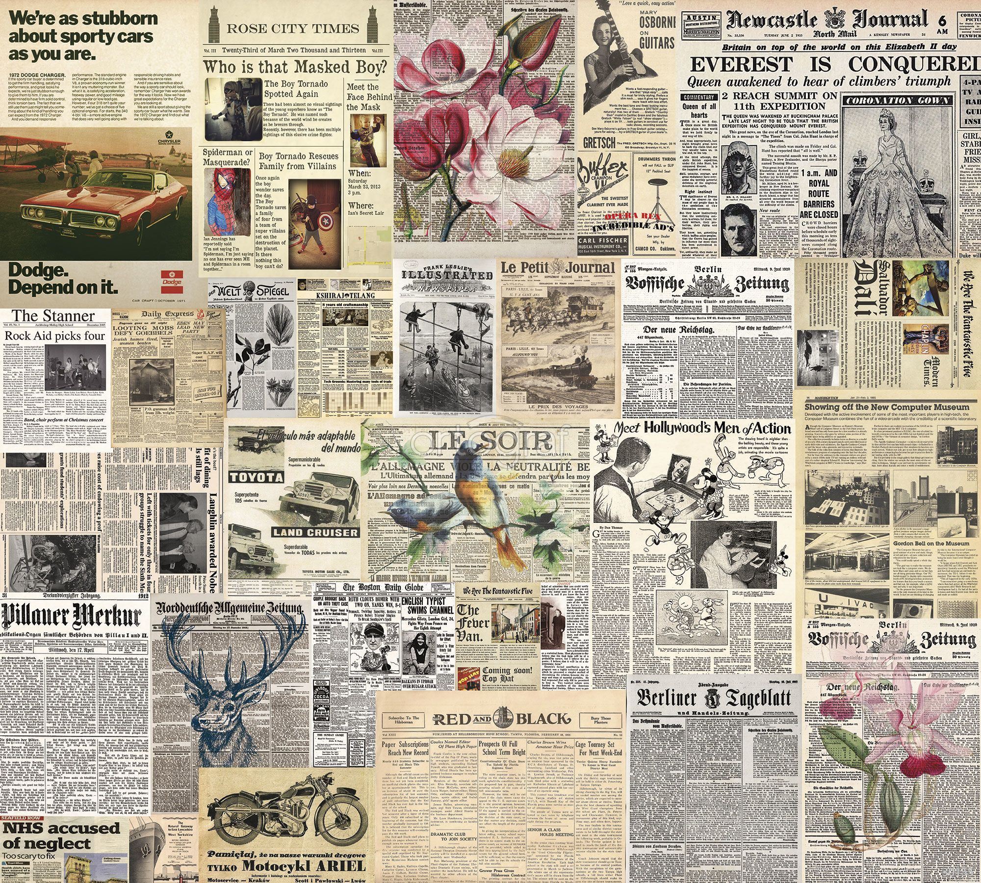 На изображении представлен выразительный коллаж из страниц газет на разных языках с типографскими заголовками, иллюстрациями, рисунками животных и растений, а также рекламными плакатами и ретро-фотографиями. Композиция объединяет элементы эпохи печатных СМИ и художественные детали, создавая впечатление динамики информационного потока, исторической хроники и стиля винтаж-принта.
